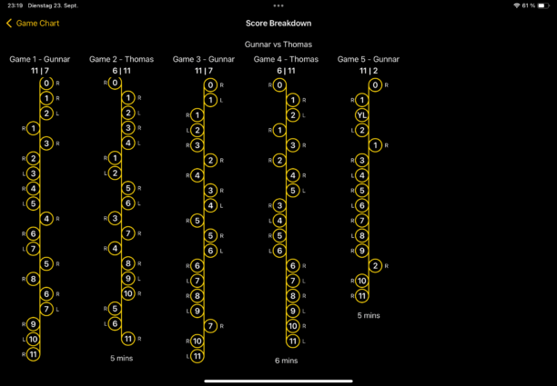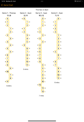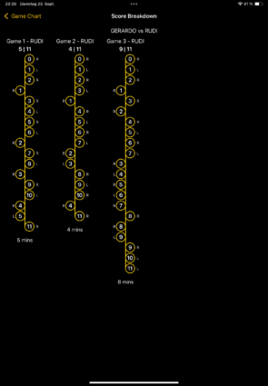Auf Position eins unterlag auch Gerardo seinem Gegner glatt in drei Sätzen. Satz eins und zwei waren sehr eindeutig, doch Satz drei machte Gerardo noch einmal spanned und kämpfte sich nach einem 2:7 in die Partie zurück und führte zwischenzeitlich sogar mit 9:8 bevor letztlich knapp mit 9:11 verlor.